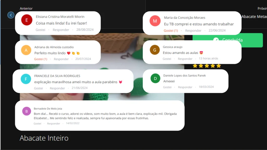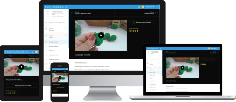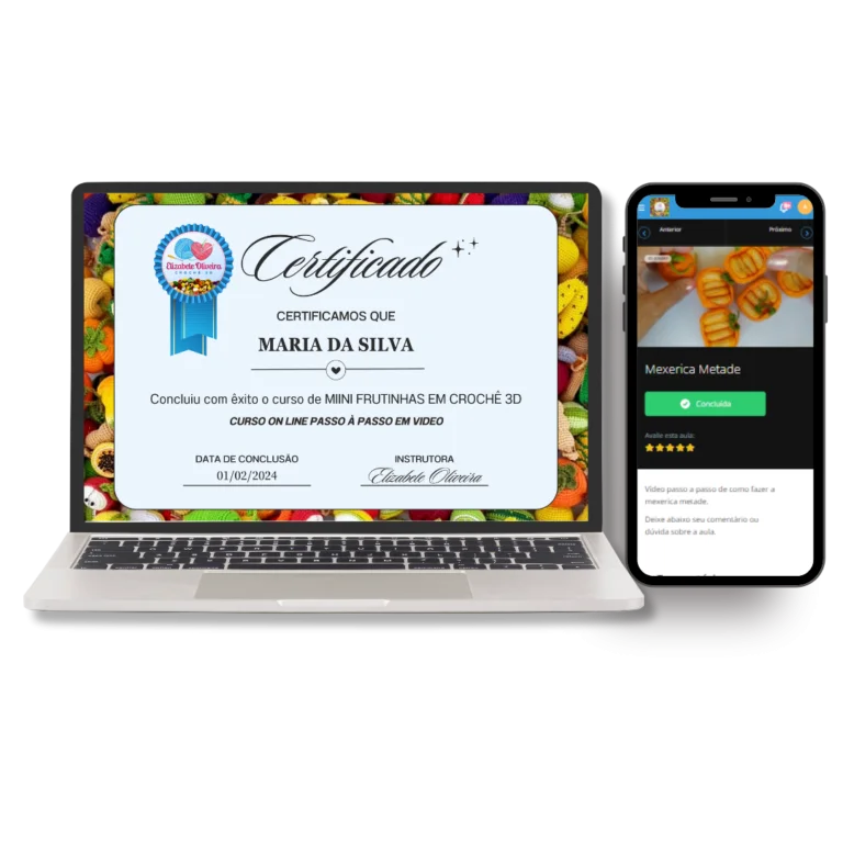 E Pensando em alcançar o máximo de pessoas possíveis com minha arte, desenvolvi o curso Mini Frutinhas de Crochê 3D, o único curso do país ensinando todo o passo a passo de como confeccionar cada frutinhas, desde os primeiros pontos. Também dou dicas de execução e matérias usados em cada peça. São mais de 75 vídeo aulas detalhadas, além de área de membros dedicada aos alunos, onde esclareço todas as duvidas.